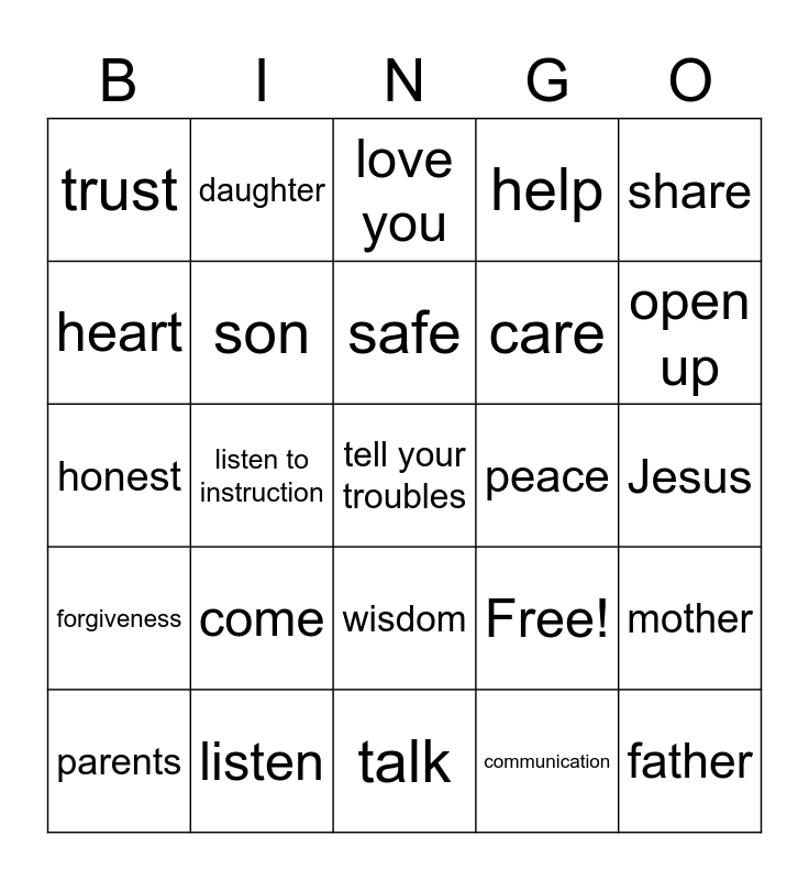 This bingo card has 25 words: come, talk, safe, parents, share, trust, heart, daughter, peace, wisdom, care, honest, Free!, mother, son, father, Jesus, love you, open up, listen to instruction, tell your troubles, listen, forgiveness, help and communication.