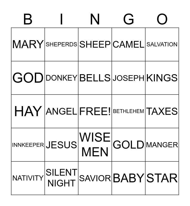 This bingo card has a free space and 24 words: JESUS, SILENT NIGHT, BELLS, NATIVITY, SALVATION, MARY, GOD, SHEPERDS, BETHLEHEM, WISE MEN, JOSEPH, HAY, GOLD, MANGER, DONKEY, BABY, TAXES, SHEEP, KINGS, ANGEL, STAR, INNKEEPER, CAMEL and SAVIOR.