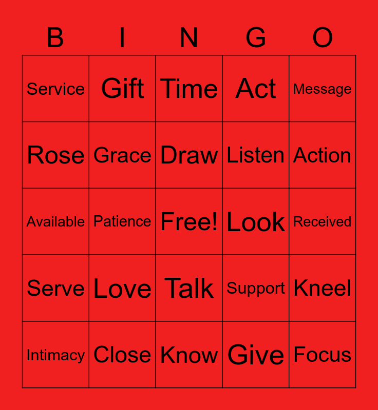 This bingo card has a free space and 24 words: Love, Close, Draw, Intimacy, Message, Service, Rose, Gift, Look, Talk, Listen, Available, Support, Kneel, Grace, Give, Received, Time, Action, Patience, Focus, Serve, Act and Know.