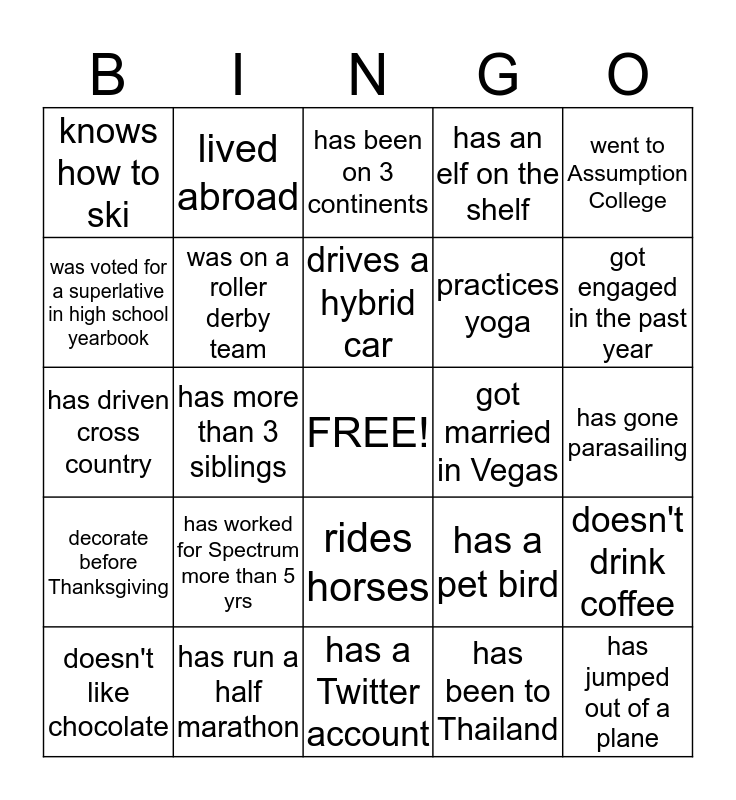 This bingo card has a free space and 24 words: has worked for Spectrum more than 5 yrs, has run a half marathon, drives a hybrid car, doesn't like chocolate, went to Assumption College, knows how to ski, was voted for a superlative in high school yearbook, lived abroad, got married in Vegas, rides horses, practices yoga, has driven cross country, has a pet bird, doesn't drink coffee, was on a roller derby team, has been to Thailand, has gone parasailing, has been on 3 continents, got engaged in the past year, has more than 3 siblings, has jumped out of a plane, decorate before Thanksgiving, has an elf on the shelf and has a Twitter account.