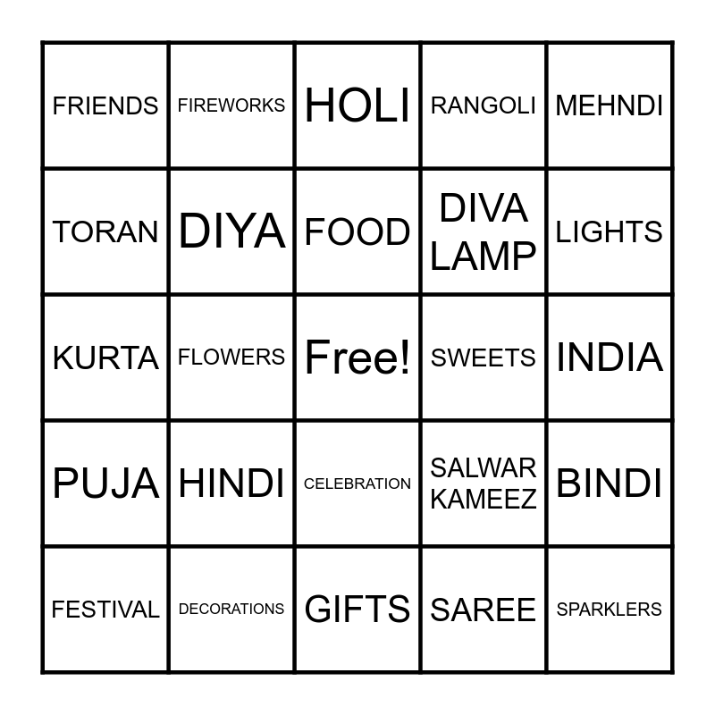 This bingo card has a free space and 29 words: FESTIVAL, PARADE, FLOWERS, DIWALI, FRIENDS, HOLI, DIYA, HINDI, SWEETS, DECORATIONS, INDIA, SPARKLERS, GIFTS, SAREE, LIGHTS, FAMILY, CELEBRATION, PUJA, MEHNDI, KURTA, SALWAR KAMEEZ, LOVE, DIVA LAMP, TORAN, RANGOLI, FIREWORKS, BINDI, FOOD and PARTIES.
