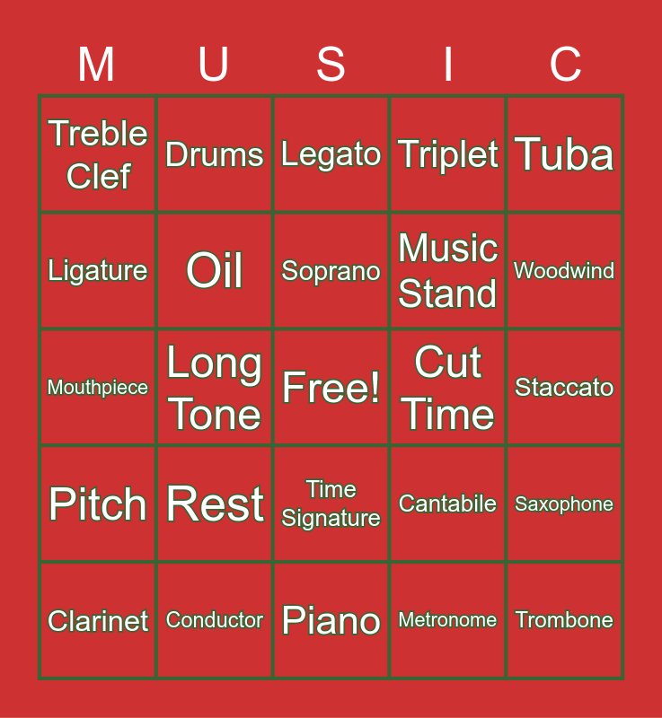 This bingo card has a free space and 44 words: Trumpet, Trombone, Flute, Clarinet, Bass Clef, Metronome, Legato, Violin, Tuba, Conductor, Triplet, Cut Time, Time Signature, Rest, Forte, Piano, Reed, Mouthpiece, Ross Roy, Woodwind, Drums, Urban Invasion, Bassoon, Treble Clef, Xylophone, Staccato, Tutti, Coda, Cantabile, Pitch, Musician, Saxophone, Baritone, Choir, Long Tone, Jazz, Blues, Bagpipes, Soprano, Ligature, Music Stand, Valve, Oil and Lip Plate.