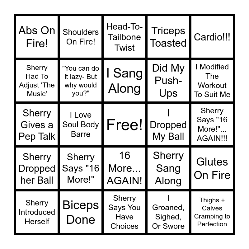 This bingo card has a free space and 24 words: Sherry Says "16 More!", Biceps Done, I Sang Along, Sherry Introduced Herself, Cardio!!!, Abs On Fire!, Sherry Had To Adjust 'The Music', Shoulders On Fire!, I Dropped My Ball, 16 More... AGAIN!, Did My Push-Ups, Sherry Gives a Pep Talk, Sherry Sang Along, Glutes On Fire, "You can do it lazy- But why would you?", I Groaned, Sighed, Or Swore, Sherry Says "16 More!"... AGAIN!!!, Head-To-Tailbone Twist, I Modified The Workout To Suit Me, I Love Soul Body Barre, Thighs + Calves Cramping to Perfection, Sherry Dropped her Ball, Triceps Toasted and Sherry Says You Have Choices.