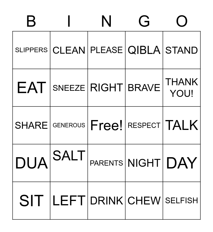 This bingo card has a free space and 24 words: SALT, LEFT, RIGHT, SIT, STAND, SLIPPERS, EAT, CLEAN, RESPECT, PARENTS, BRAVE, SHARE, NIGHT, DAY, SNEEZE, CHEW, TALK, PLEASE, THANK YOU!, GENEROUS, SELFISH, DUA, QIBLA and DRINK.
