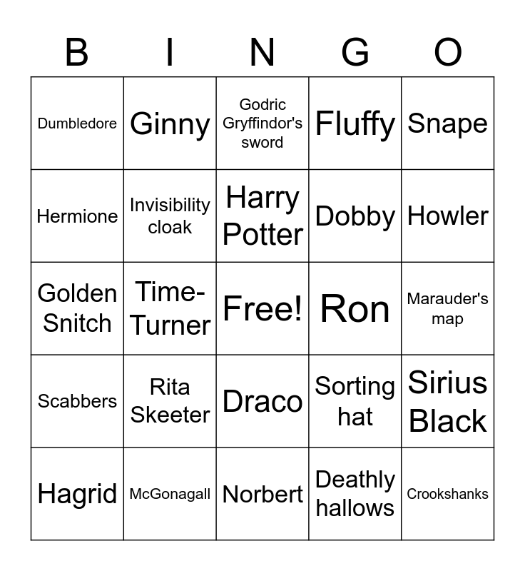 This bingo card has a free space and 24 words: Rita Skeeter, McGonagall, Harry Potter, Hagrid, Snape, Dumbledore, Hermione, Ginny, Ron, Draco, Dobby, Golden Snitch, Sorting hat, Sirius Black, Invisibility cloak, Deathly hallows, Marauder's map, Godric Gryffindor's sword, Howler, Time-Turner, Crookshanks, Scabbers, Fluffy and Norbert.