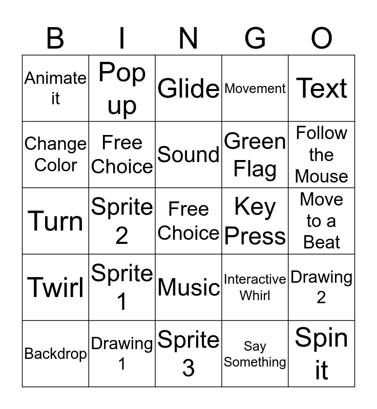 This bingo card has a free space and 24 words: Sprite 1, Drawing 1, Sound, Backdrop, Text, Animate it, Change Color, Pop up, Key Press, Music, Green Flag, Turn, Interactive Whirl, Drawing 2, Free Choice, Say Something, Move to a Beat, Glide, Follow the Mouse, Sprite 2, Spin it, Twirl, Movement and Sprite 3.