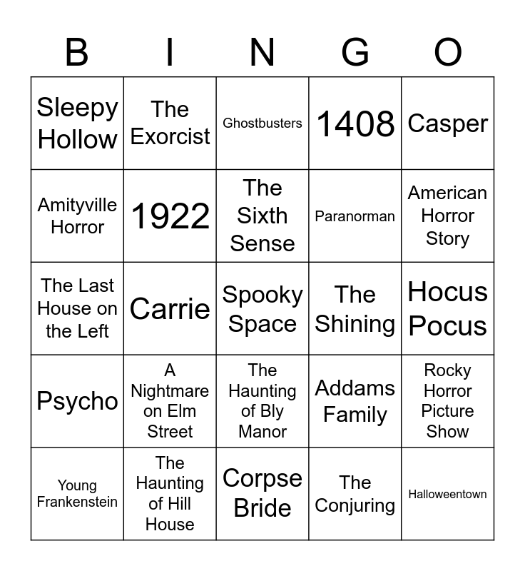 This bingo card has a free space and 30 words: The Haunting of Hill House, The Nightmare Before Christmas, Carrie, Beetlejuice, Sleepy Hollow, Ghostbusters, 1922, The Haunting of Bly Manor, The Shining, Corpse Bride, Hocus Pocus, Halloweentown, The Conjuring, Coraline, American Horror Story, Edward Scissorhands, Addams Family, Psycho, A Nightmare on Elm Street, Casper, The Last House on the Left, The Babadook, The Exorcist, Paranorman, Amityville Horror, 1408, Rocky Horror Picture Show, Young Frankenstein, The Sixth Sense and Spooky Space.