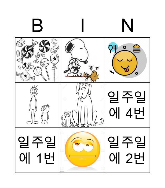 This bingo card has 9 images, a free space and 5 words: 일주일에 1번, 일주일에 2번, 일주일에 3번, 일주일에 4번 and 매일.