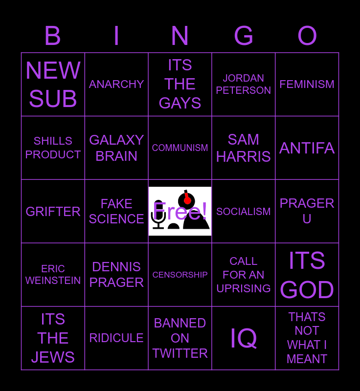 This bingo card has a free space and 61 words: BAD FAITH, RIDICULE, BRET WEINSTEIN, ERIC WEINSTEIN, IQ, CRINGEY SLUR, GALAXY BRAIN, PHRENOLOGY, SAM HARRIS, DAVE RUBIN, JORDAN PETERSON, BEEF DAUGHTER, SHILLS PRODUCT, BEN SHAPIRO, NEW FOLLOW, NEW SUB, THATS NOT WHAT I MEANT, FEMINISM, MARXISM, COMMUNISM, SOCIALISM, ITS THE GAYS, ITS THE JEWS, ITS GOD, STEVEN CROWDER, WE LIVE IN A SOCIETY, GLOBE IN THE BACKGROUND, BRAINWASHED, ANTIFA, FASCISM, THE LEFT, 4 SYLLABLE WORD, SHOW US YOUR BOOKS!, POLITICALLY CORRECT, ANARCHY, 3 SYLLABLE WORD, MEDICAL TERMS, FAKE SCIENCE, GOVERNMENT HANDOUTS, GRIFTER, VENTURE CAPITALIST, DENNIS PRAGER, PRAGER U, THE QUARTERING, CALL FOR AN UPRISING, INCEL, MGTOW, BIG TECH, SHADOWBANNED, CENSORSHIP, BANNED ON TWITTER, FREE SPEECH, MENS RIGHTS, FAMILY VALUES, STRAWMAN, INTENT, INTELLECTUAL, AD HOMINIM, GENDER, I'M A "INSERT THING THEY'RE NOT" and POP PSYCHOLOGY.