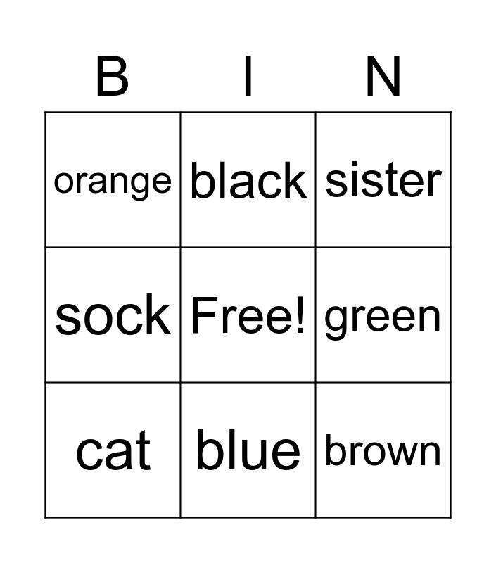 This bingo card has a free space and 24 words: eyes, yellow, blue, red, brown, orange, green, black, white, shoes, hair, colour, sweater, dog, cat, name, brother, sister, parents, hockey, tennis, pants, sock and football.