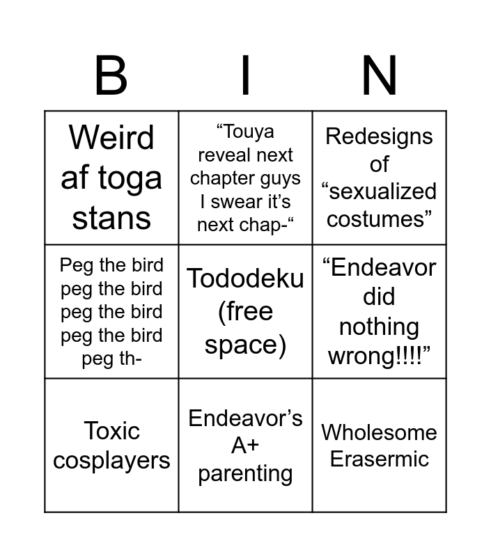 This bingo card has a free space and 22 words: “Bakudeku is abuse!!!!”, Harassing horikoshi, “Touya reveal next chapter guys I swear it’s next chap-“, villain stans, “Endeavor did nothing wrong!!!!”, Toxic cosplayers, Weird af toga stans, Redesigns of “sexualized costumes”, “Hawks did nothing wrong!!!”, “Kiribaku is canon!”, Compresshoes, Peg the bird peg the bird peg the bird peg the bird peg th-, “Studio bones butchered *insert random moment or character here*”, Iida’s red eyes, “Aizawa is DADDY”, thirsty dabi stans, ReVelrY iN thE dArK, “Are you *insert character here*’s secret love child or something?”, Dadzawa and shinson, Wholesome Erasermic, Endeavor’s A+ parenting and Eri being cute.