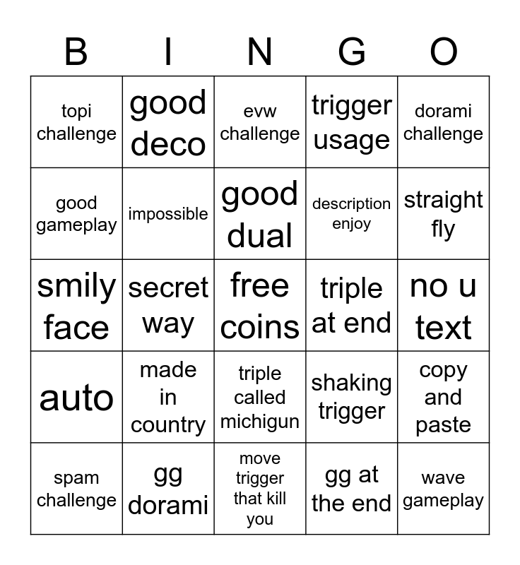This bingo card has a free space and 24 words: made in country, gg dorami, good dual, spam challenge, dorami challenge, topi challenge, good gameplay, good deco, triple at end, triple called michigun, description enjoy, smily face, shaking trigger, copy and paste, impossible, gg at the end, no u text, evw challenge, straight fly, secret way, wave gameplay, auto, trigger usage and move trigger that kill you.