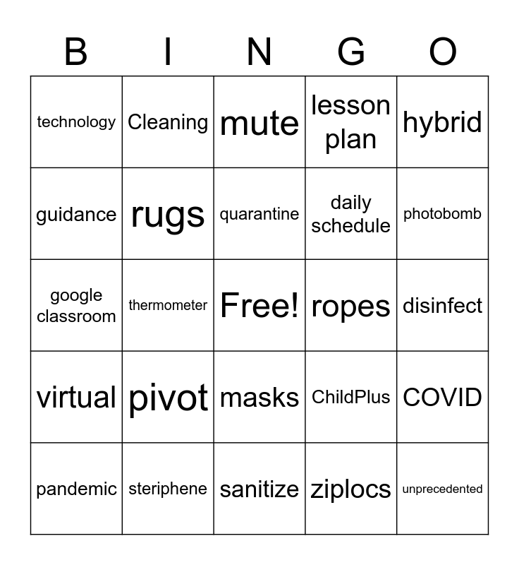 This bingo card has a free space and 30 words: steriphene, smocks, thermometer, zoom, technology, mute, rugs, masks, ropes, sanitize, disinfect, unprecedented, ziplocs, bins, photobomb, attendance, ChildPlus, virtual, pivot, hybrid, google classroom, Docusign, Cleaning, daily schedule, guidance, lesson plan, COVID, pandemic, quarantine and email.