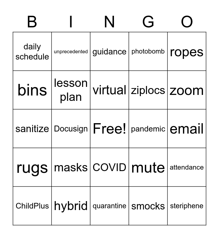 This bingo card has a free space and 30 words: hybrid, google classroom, Docusign, Cleaning, daily schedule, guidance, lesson plan, COVID, pandemic, quarantine, email, steriphene, smocks, thermometer, zoom, technology, mute, rugs, masks, ropes, sanitize, disinfect, unprecedented, ziplocs, bins, photobomb, attendance, ChildPlus, virtual and pivot.