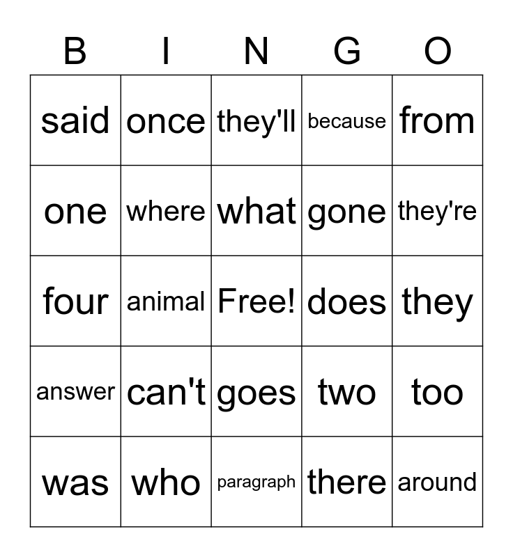 This bingo card has a free space and 24 words: can't, who, what, was, from, said, one, once, does, goes, gone, four, two, too, where, there, they, they'll, they're, animal, around, answer, because and paragraph.