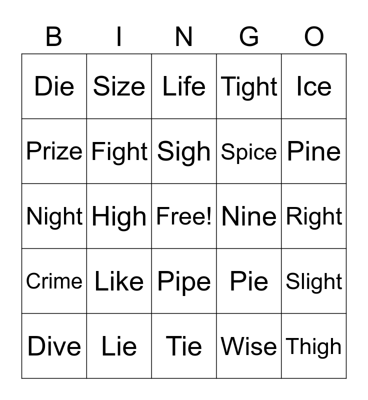 This bingo card has a free space and 24 words: Like, Lie, Sigh, Dive, Ice, Die, Prize, Size, Nine, Pipe, Spice, Night, Pie, Slight, Fight, Wise, Right, Life, Pine, High, Thigh, Crime, Tight and Tie.