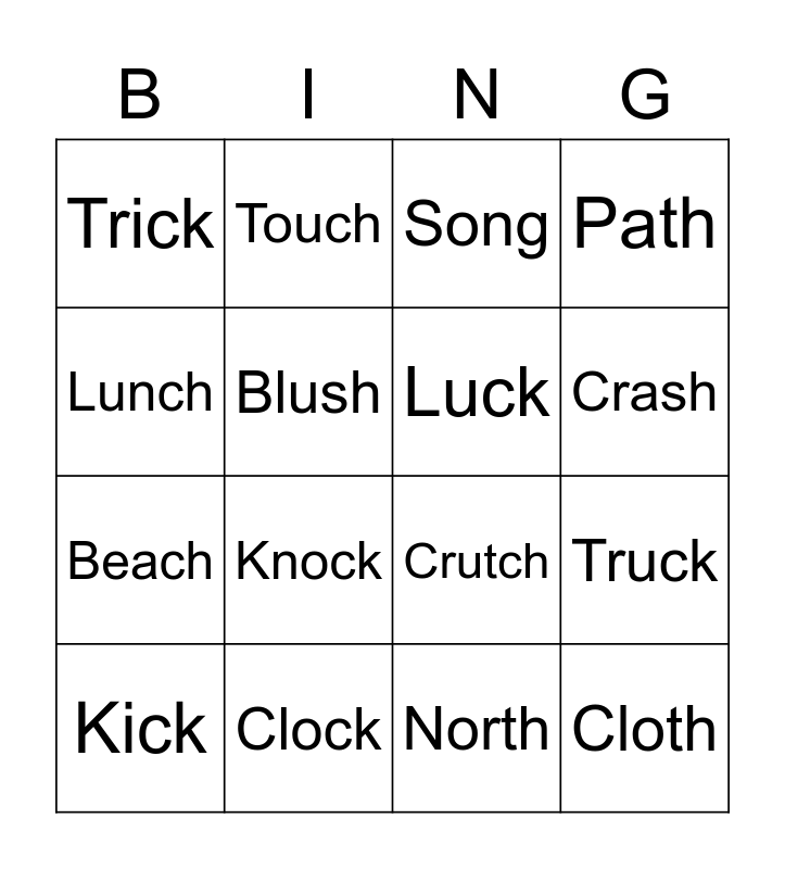This bingo card has 16 words: Clock, Truck, Song, Trick, Beach, Touch, Crutch, North, Lunch, Blush, Kick, Path, Knock, Crash, Luck and Cloth.