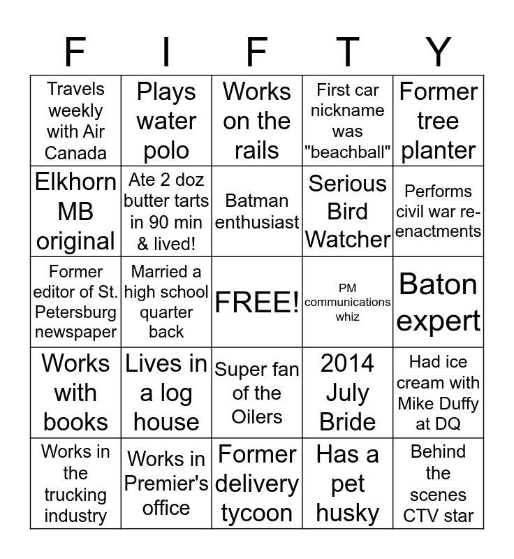 This bingo card has a free space and 24 words: Lives in a log house, Works in Premier's office, Batman enthusiast, Works in the trucking industry, Former tree planter, Travels weekly with Air Canada, Elkhorn MB original, Plays water polo, PM communications whiz, Super fan of the Oilers, Serious Bird Watcher, Former editor of St. Petersburg newspaper, 2014 July Bride, Had ice cream with Mike Duffy at DQ, Ate 2 doz butter tarts in 90 min & lived!, Has a pet husky, Baton expert, Works on the rails, Performs civil war re-enactments, Married a high school quarter back, Behind the scenes CTV star, Works with books, First car nickname was "beachball" and Former delivery tycoon.
