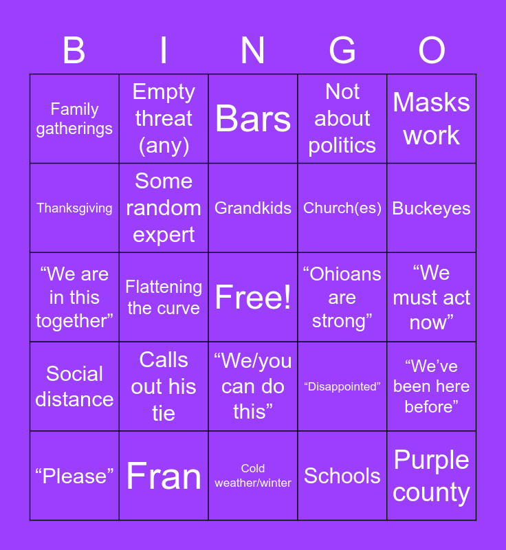 This bingo card has a free space and 24 words: Calls out his tie, Fran, Grandkids, “Please”, Masks work, Family gatherings, Thanksgiving, Empty threat (any), “Ohioans are strong”, “We/you can do this”, Church(es), “We are in this together”, “Disappointed”, “We’ve been here before”, Some random expert, Schools, “We must act now”, Bars, Buckeyes, Flattening the curve, Purple county, Social distance, Not about politics and Cold weather/winter.