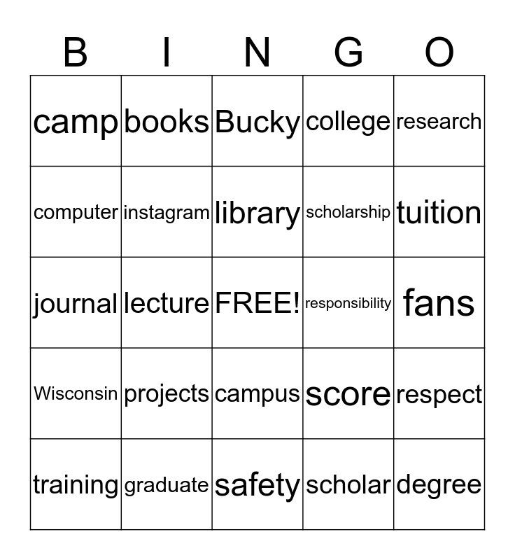 This bingo card has a free space and 76 words: university, soccer, Bucky, red, white, Jump Around, football, basketball, hockey, swimming, golf, wrestling, library, computer, exam, lecture, study, degree, career, research, papers, journal, instagram, books, college, presentation, professor, classes, jersey, practice, traveling, teamwork, goal, score, tuition, scholarship, compete, tournament, fans, scholar, education, role model, learning, Marching Band, workshops, meetings, training, camp, spirit, home/away, student, campus, official, Badger, time management, pride, drills, Madison, NCAA, conference, projects, regulations, player, quiz, nutrition, sportsmanship, responsibility, schedule, referee, athlete, respect, Wisconsin, graduate, work-out, safety and performance.