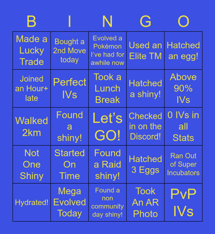 This bingo card has a free space and 24 words: Started On Time, Mega Evolved Today, Took a Lunch Break, Hydrated!, Hatched an egg!, Made a Lucky Trade, Joined an Hour+ late, Bought a 2nd Move today, Checked in on the Discord!, Found a Raid shiny!, Hatched a shiny!, Walked 2km, Hatched 3 Eggs, Ran Out of Super Incubators, Perfect IVs, Took An AR Photo, 0 IVs in all Stats, Evolved a Pokémon I’ve had for awhile now, Above 90% IVs, Found a shiny!, PvP IVs, Not One Shiny, Used an Elite TM and Found a non community day shiny!.