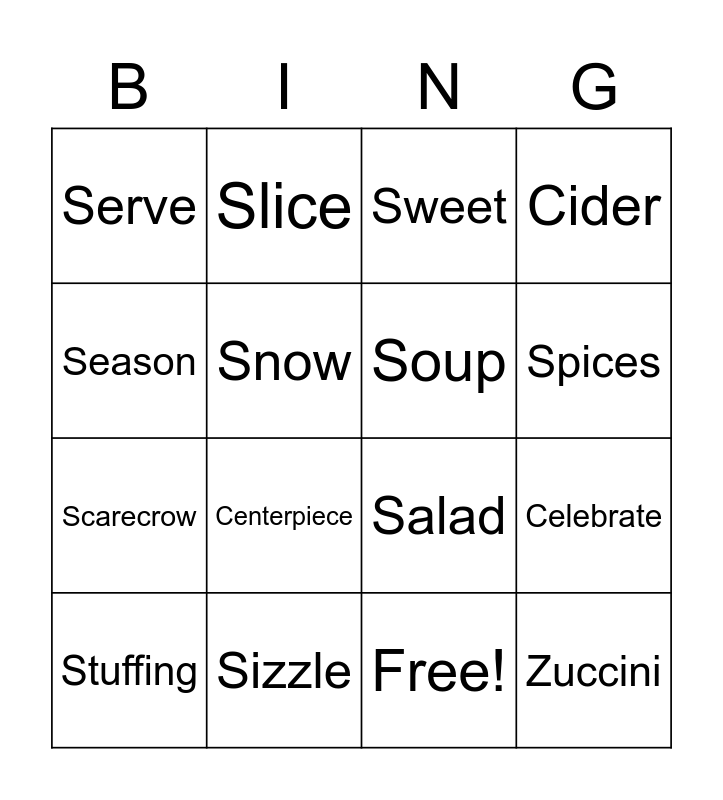 This bingo card has 17 words: Free!, Stuffing, Sweet, Serve, Centerpiece, Cider, Celebrate, Soup, Spices, Snow, Sizzle, Salad, Season, Slice, Scarecrow, Zesty and Zuccini.