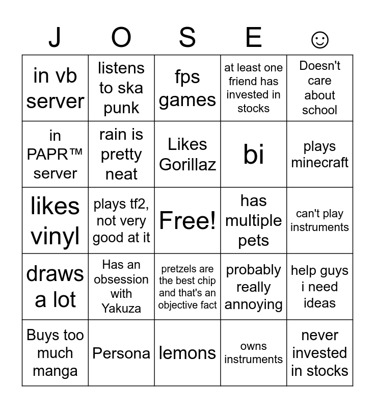 This bingo card has a free space and 24 words: Has an obsession with Yakuza, Persona, Likes Gorillaz, Buys too much manga, Doesn't care about school, in vb server, in PAPR™ server, listens to ska punk, has multiple pets, pretzels are the best chip and that's an objective fact, bi, likes vinyl, probably really annoying, help guys i need ideas, rain is pretty neat, owns instruments, can't play instruments, fps games, plays minecraft, plays tf2, not very good at it, never invested in stocks, draws a lot, at least one friend has invested in stocks and lemons.