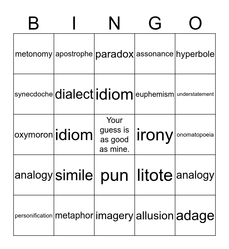 This bingo card has a free space and 24 words: simile, metaphor, idiom, personification, hyperbole, metonomy, synecdoche, apostrophe, irony, pun, euphemism, oxymoron, litote, analogy, dialect, allusion, onomatopoeia, paradox, understatement, idiom, adage, analogy, assonance and imagery.