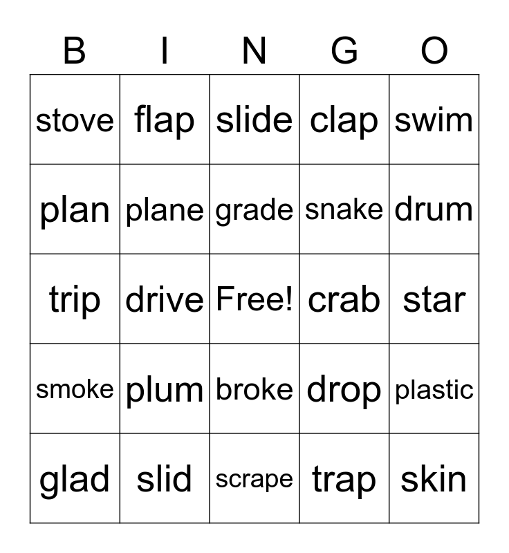 This bingo card has a free space and 29 words: frog, slid, slide, smile, swim, stove, plane, grade, crab, plastic, glad, drive, trap, skin, trip, scrap, scrape, drop, drum, smoke, plum, brush, snake, star, plan, flap, broke, clap and grab.