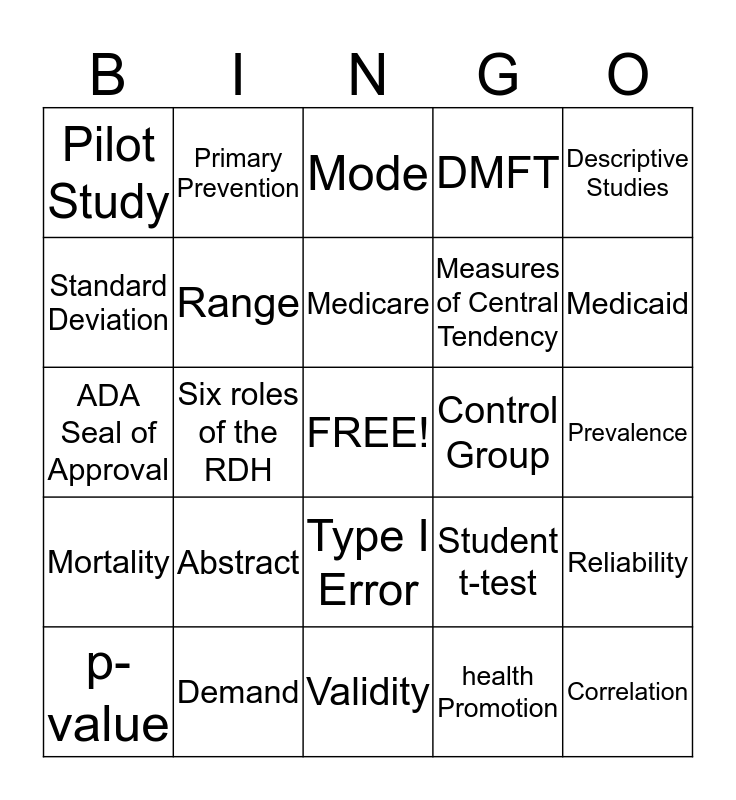 This bingo card has a free space and 24 words: Abstract, Demand, Medicare, p-value, Descriptive Studies, Pilot Study, Standard Deviation, Primary Prevention, Control Group, Type I Error, Measures of Central Tendency, ADA Seal of Approval, Student t-test, Reliability, Range, health Promotion, Prevalence, Mode, Medicaid, Six roles of the RDH, Correlation, Mortality, DMFT and Validity.