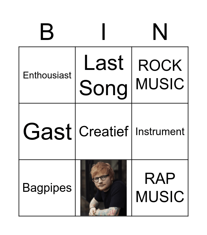 This bingo card has 3 images, a free space and 14 words: POP MUZIEK, Gitaar, ROCK MUSIC, Enthousiast, Famous, Gast, Sound, Bagpipes, Instrument, Show, RAP MUSIC, Last Song, Choose a song and Een liedje delen.