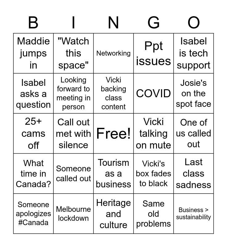 This bingo card has a free space and 24 words: Someone called out, Melbourne lockdown, Vicki backing class content, Someone apologizes #Canada, Isabel is tech support, Maddie jumps in, Isabel asks a question, "Watch this space", Vicki talking on mute, Tourism as a business, COVID, 25+ cams off, Vicki's box fades to black, Last class sadness, Looking forward to meeting in person, Same old problems, One of us called out, Networking, Josie's on the spot face, Call out met with silence, Business > sustainability, What time in Canada?, Ppt issues and Heritage and culture.