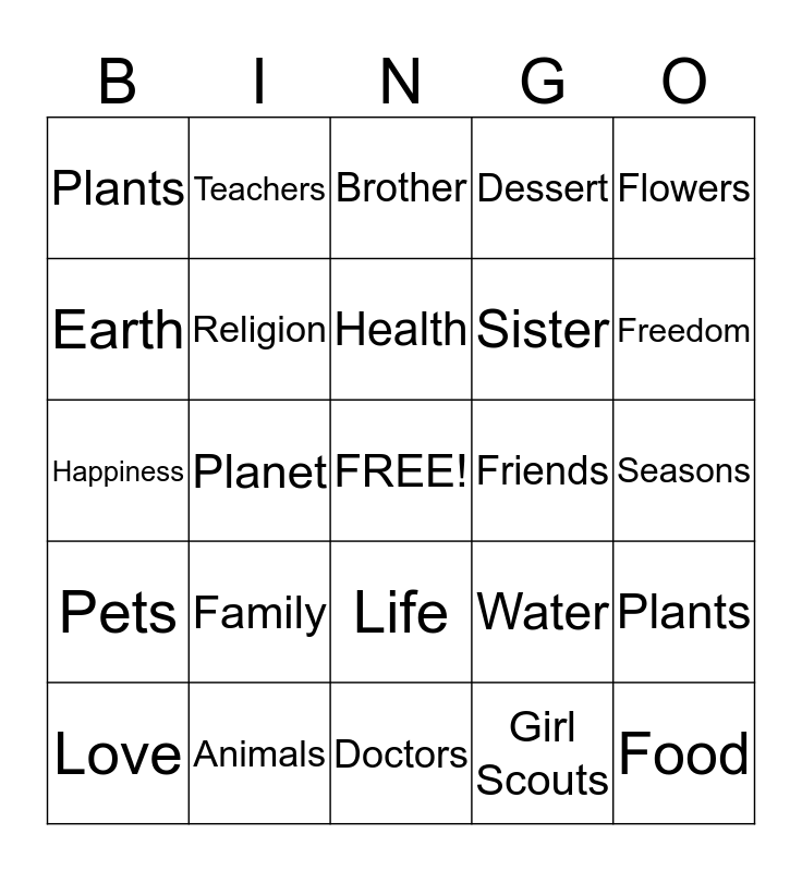 This bingo card has a free space and 24 words: Family, Animals, Health, Love, Flowers, Plants, Earth, Teachers, Friends, Life, Sister, Happiness, Water, Plants, Religion, Girl Scouts, Seasons, Brother, Freedom, Planet, Food, Pets, Dessert and Doctors.