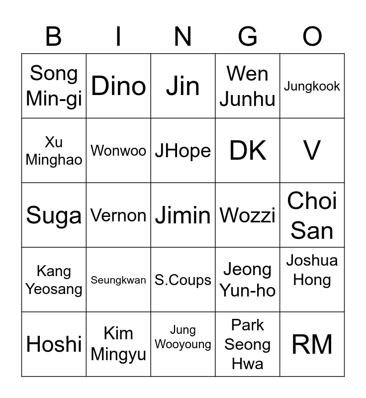 This bingo card has a free space and 24 words: Seungkwan, Kim Mingyu, JHope, Hoshi, Jungkook, Song Min-gi, Xu Minghao, Dino, Wozzi, S.Coups, DK, Suga, Jeong Yun-ho, Joshua Hong, Wonwoo, Park Seong Hwa, Choi San, Jin, V, Vernon, RM, Kang Yeosang, Wen Junhu and Jung Wooyoung.