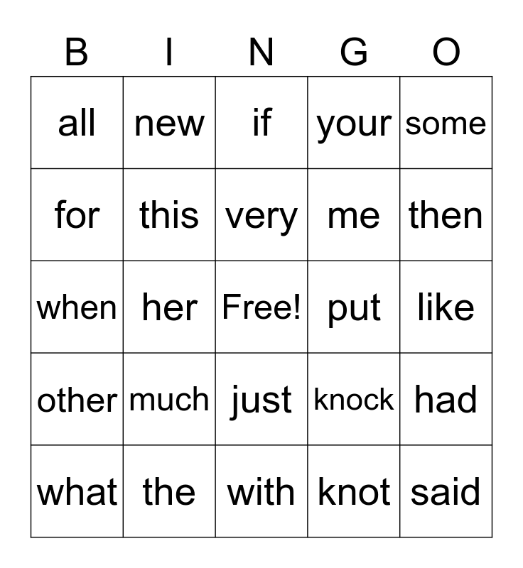 This bingo card has a free space and 24 words: what, much, very, knot, some, all, new, if, put, like, when, this, knock, had, for, the, with, your, then, other, her, just, me and said.