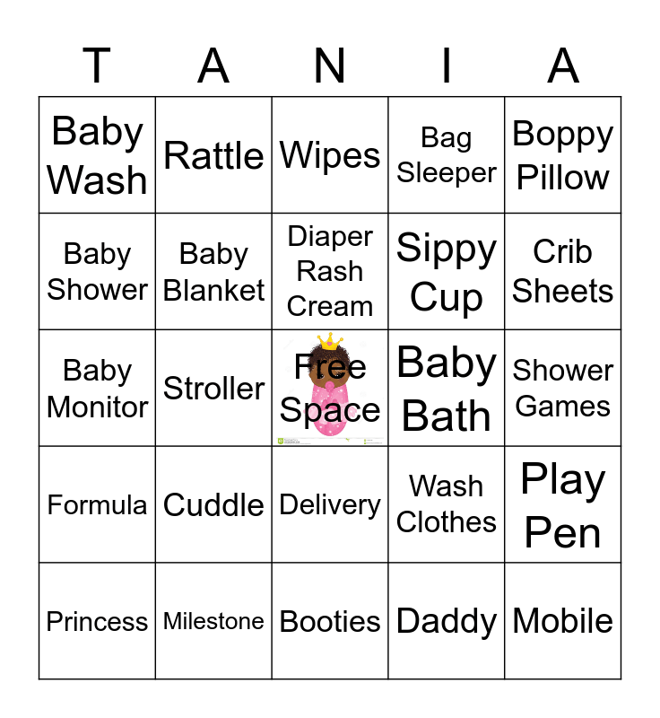 This bingo card has a free space and 57 words: Baby Girl, Princess, Baby Bottle, Baby Wash, Booties, Diapers, Baby Blanket, Onesies, Sippy Cup, Footie Sleeper, Bag Sleeper, Crib, Crib Mattress, Bassinet, Car Seat, High Chair, Boppy Pillow, Stroller, Pacifier, Mobile, Baby Bath, Diaper bag, Wash Clothes, Wipes, Baby Book, Diaper Rash Cream, Breast Pump, Nursing pads, Crib Sheets, Maternity Leave, Delivery, Ultra Sound, Booties, Layette, Shower Games, Baby Shower, Baby Powder, Baby Monitor, Stork, Formula, Rattle, Delivery, Colic, Swing, Bib, Lullaby, Cuddle, Milestone, Nap-time, Daycare, Mommy, Daddy, Milk, Bath-time, Rubber Ducky, Play Pen and Nursery.