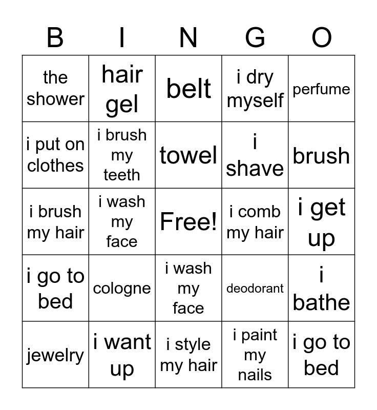 This bingo card has a free space and 24 words: cologne, i want up, towel, jewelry, perfume, the shower, i put on clothes, hair gel, i comb my hair, i wash my face, i shave, i brush my hair, deodorant, i bathe, i brush my teeth, i paint my nails, i get up, belt, brush, i wash my face, i go to bed, i go to bed, i dry myself and i style my hair.