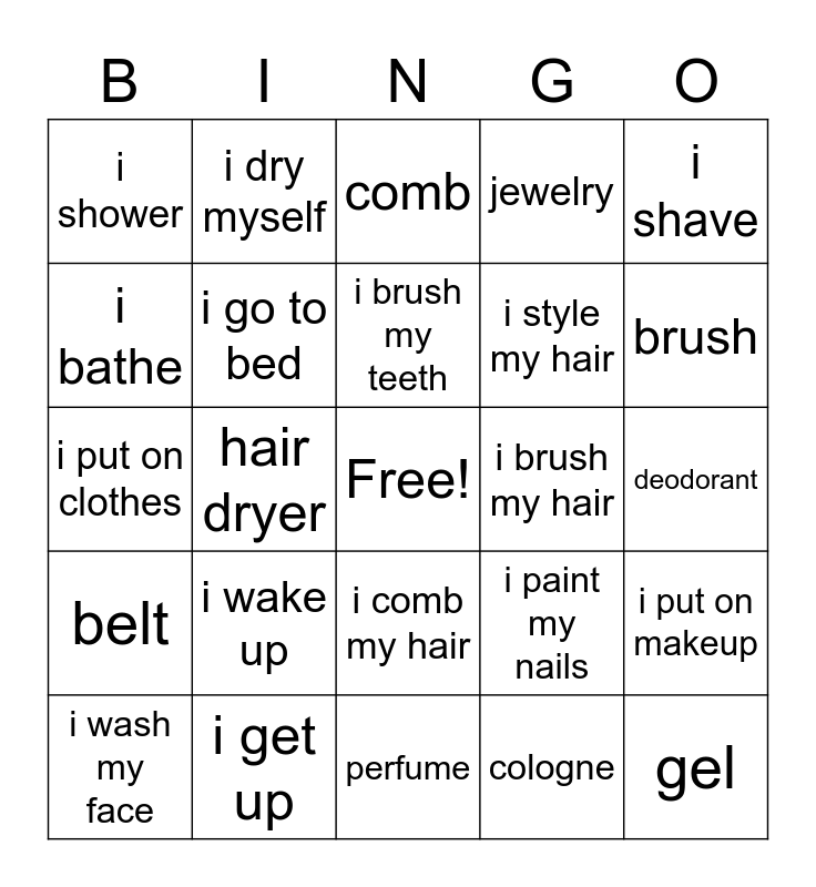 This bingo card has a free space and 24 words: i wake up, i get up, i brush my teeth, i wash my face, i shave, i shower, i bathe, i dry myself, i brush my hair, i comb my hair, i style my hair, i put on clothes, i paint my nails, i put on makeup, i go to bed, cologne, deodorant, comb, brush, hair dryer, gel, belt, jewelry and perfume.