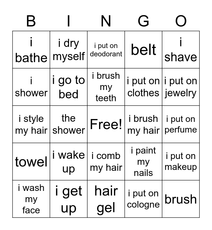 This bingo card has a free space and 24 words: i wake up, i get up, i brush my teeth, i wash my face, i shave, i bathe, i shower, i dry myself, i brush my hair, i comb my hair, i put on clothes, i style my hair, i paint my nails, i put on makeup, i go to bed, i put on cologne, i put on perfume, i put on deodorant, i put on jewelry, the shower, brush, towel, belt and hair gel.