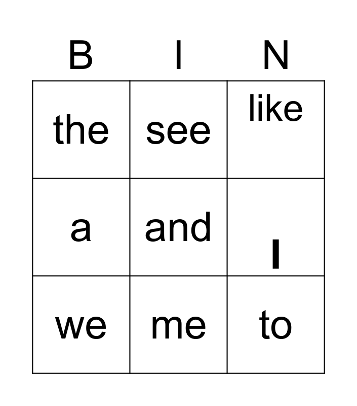 This bingo card has a free space and 8 words: I, like, see, we, the, to, a and me.