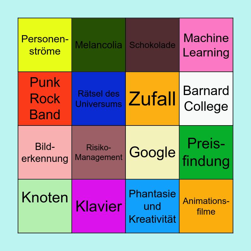 This bingo card has 17 words: Phantasie und Kreativität, Knoten, Schokolade, Personen-ströme, Risiko-Management, Machine Learning, Preis-findung, Zufall, Barnard College, Rätsel des Universums, Klavier, Google, Punk Rock Band, Melancolia, Bild-erkennung, Automobil-industrie and Animations-filme.