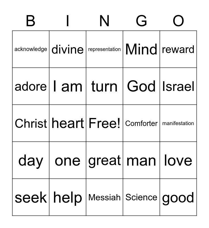 This bingo card has a free space and 24 words: one, help, turn, seek, reward, acknowledge, adore, divine, Comforter, great, God, Christ, man, love, I am, Science, manifestation, representation, Israel, heart, good, day, Mind and Messiah.