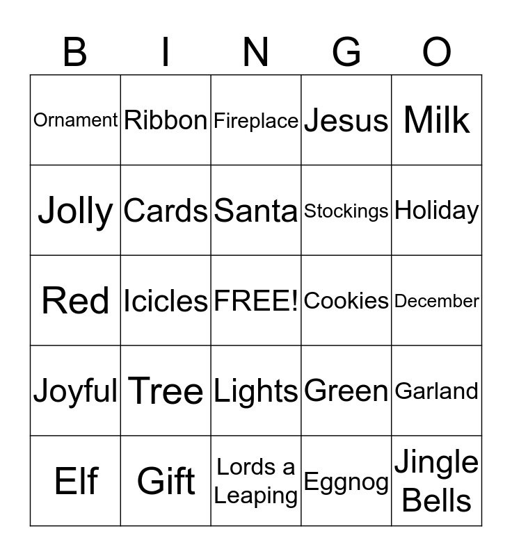 This bingo card has a free space and 24 words: Tree, Gift, Santa, Elf, Milk, Ornament, Jolly, Ribbon, Cookies, Lights, Stockings, Red, Green, Garland, Cards, Eggnog, December, Fireplace, Holiday, Icicles, Jingle Bells, Joyful, Jesus and Lords a Leaping.