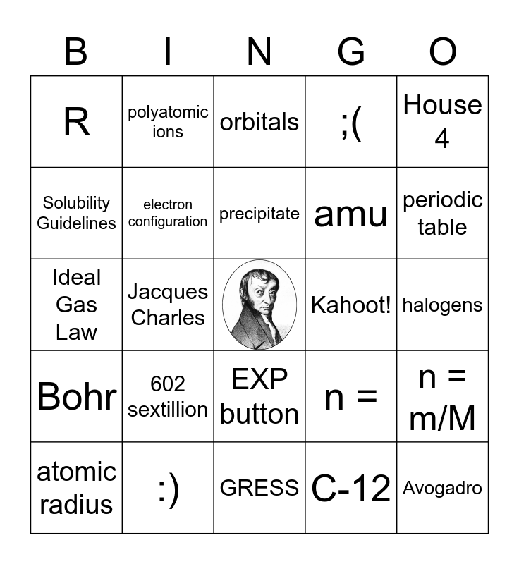 This bingo card has a free space and 44 words: the mole, Avogadro, pipette, atomic radius, g/mol, C-12, orbitals, rm 242, House 4, :), ;(, Kahoot!, EXP button, 602 sextillion, significant digits, GRESS, units, Ideal Gas Law, +273K, periodic table, polyatomic ions, pressure, volume, R, Activity Series, halogens, rare earth metals, group 1, n =, Bohr, scientific calculator, n = m/M, c = n/V, T, Jacques Charles, Boyle, Combined Gas Law, 8.314, precipitate, Solubility Guidelines, amu, abundance, electron configuration and Quad 1.