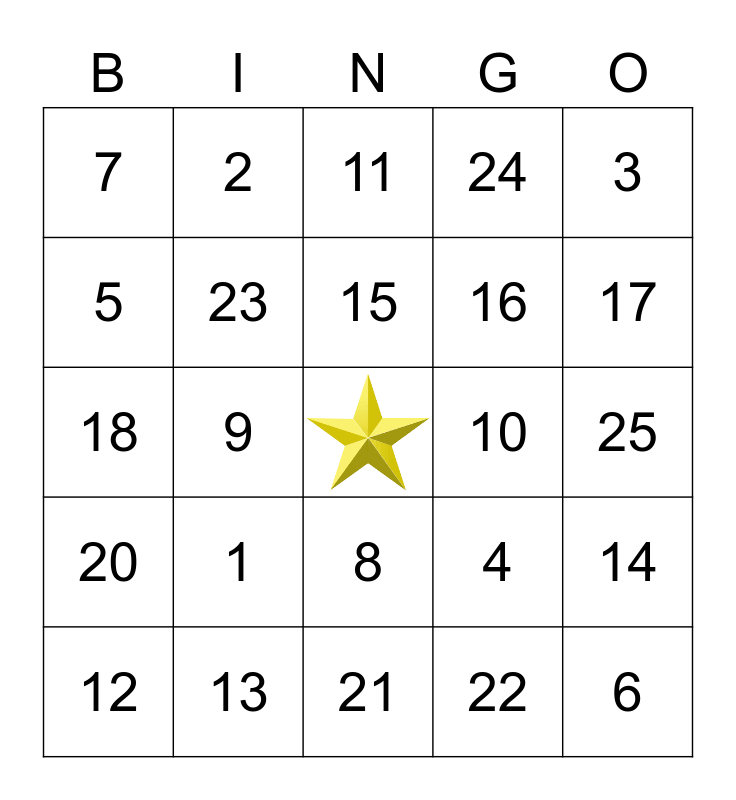 This bingo card has a free space and 24 words: 1, 13, 15, 12, 3, 7, 5, 2, 10, 8, 16, 18, 4, 14, 23, 22, 25, 11, 17, 9, 6, 20, 24 and 21.