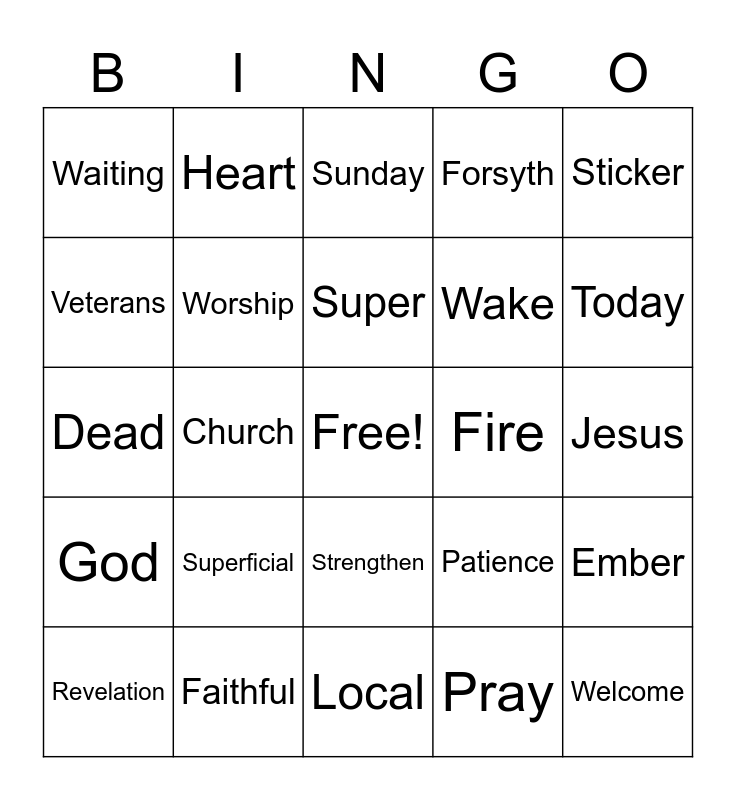 This bingo card has a free space and 24 words: Superficial, Faithful, Super, Revelation, Sticker, Waiting, Veterans, Heart, Fire, Strengthen, Wake, Dead, Patience, Ember, Worship, Pray, Jesus, Sunday, Today, Church, Welcome, God, Forsyth and Local.