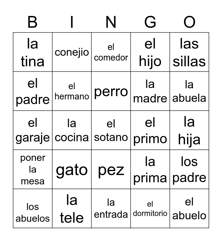 This bingo card has a free space and 24 words: los abuelos, gato, perro, el dormitorio, las sillas, la tina, conejio, el comedor, el primo, la hija, el garaje, el hermano, la prima, los padre, el padre, la tele, la entrada, el hijo, la abuela, poner la mesa, la cocina, pez, la madre and el abuelo.