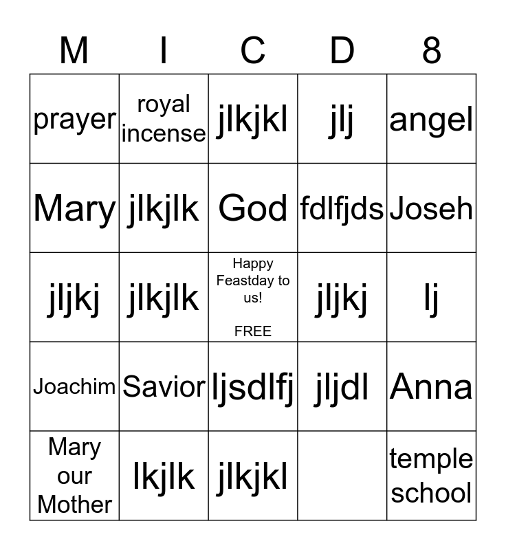 This bingo card has a free space and 23 words: Joachim, Mary our Mother, God, Anna, angel, prayer, Mary, royal incense, temple school, Savior, Joseh, fdlfjds, ljsdlfj, jljdl, jljkj, jlkjkl, jlkjkl, jljkj, jlkjlk, jlkjlk, jlj, lj and lkjlk.