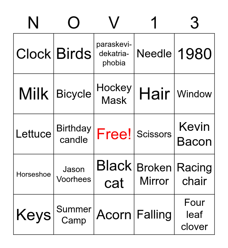 This bingo card has a free space and 25 words: Jason Voorhees, Acorn, Hockey Mask, Keys, 1980, Clock, Milk, Birds, Scissors, Black cat, Hair, Lettuce, Broken Mirror, Racing chair, Bicycle, 2026, Kevin Bacon, paraskevi-dekatria-phobia, Window, Birthday candle, Four leaf clover, Summer Camp, Horseshoe, Needle and Falling.