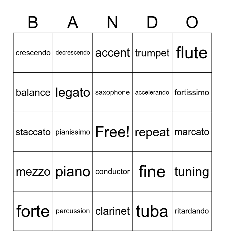 This bingo card has a free space and 24 words: forte, piano, saxophone, tuba, flute, crescendo, decrescendo, accent, repeat, marcato, staccato, legato, fine, tuning, balance, percussion, clarinet, trumpet, fortissimo, mezzo, pianissimo, conductor, accelerando and ritardando.